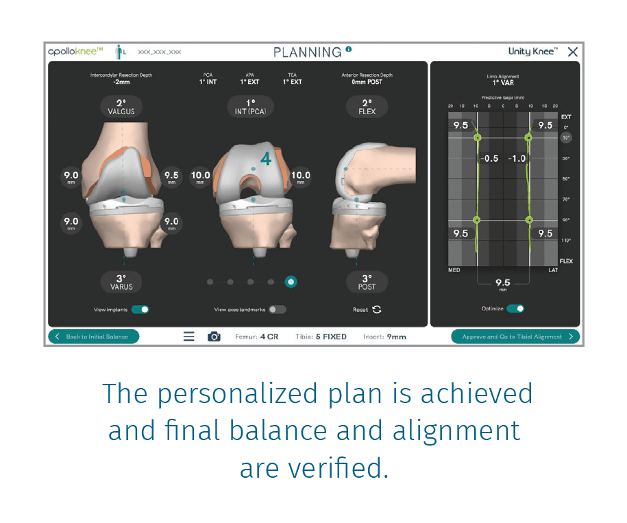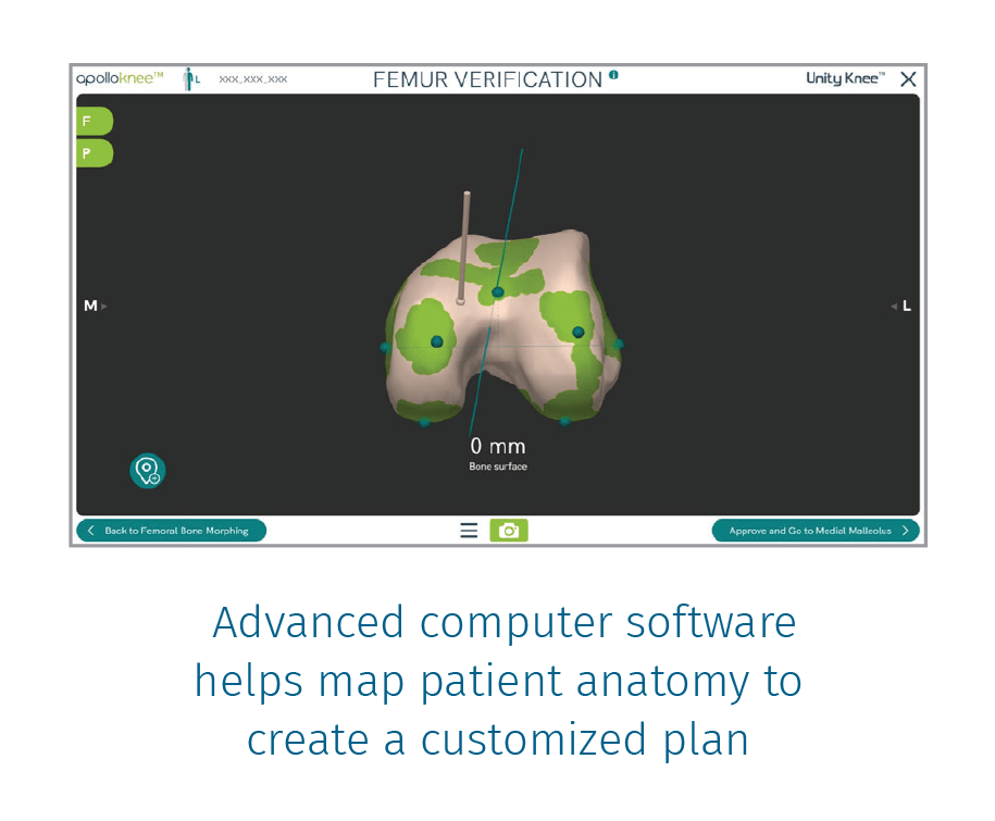 Combining the 3D model with your range of motion data, the surgeon uses Apollo to adjust the planned placement of your total knee components. This results in a personalised surgical plan designed for your best fit, function, and stability.